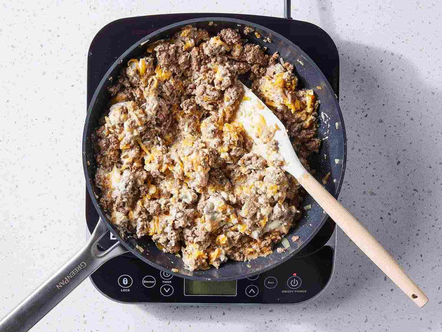 - Step 3:Mix together ground beef and onion soup mix in a large skillet; cook and stir over medium-high heat until beef is crumbly and evenly browned, 5 to 7 minutes. Drain and discard any excess grease. Dotdash Meredith Food Studios