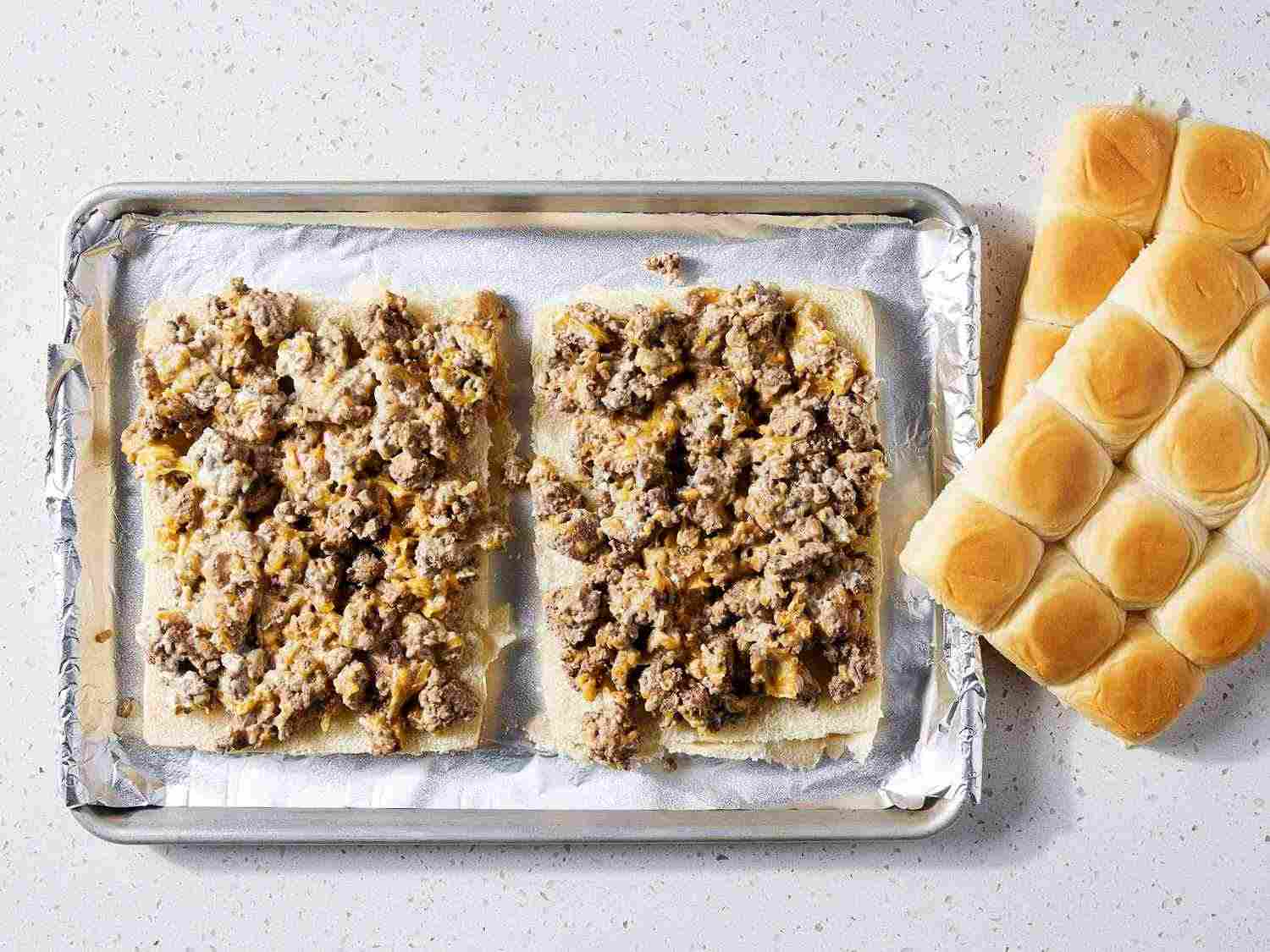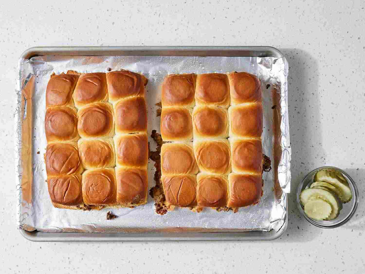 - Step 5:Place roll bottoms on the prepared baking sheet. Spread beef mixture onto each bottom. Cover with tops. Cover sandwiches with the prepared sheet of aluminum foil. Dotdash Meredith Food Studios